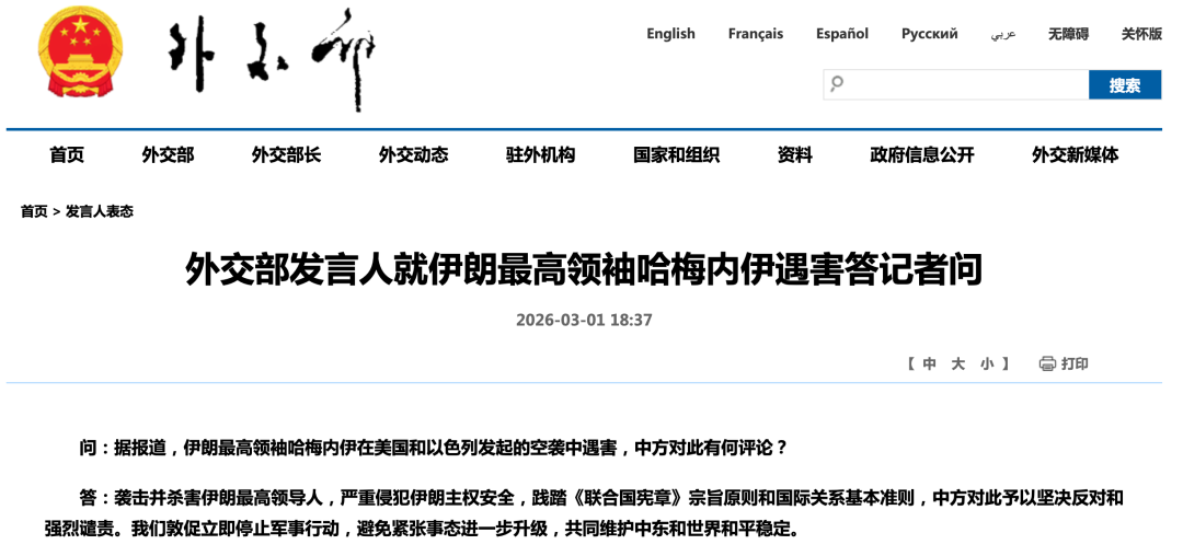 3月1日,据外交部网站消息,外交部发言人就伊朗最高领袖哈梅内伊遇害答记者问。